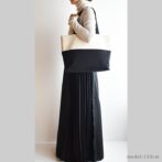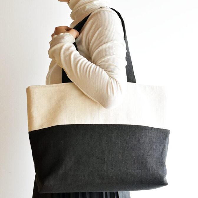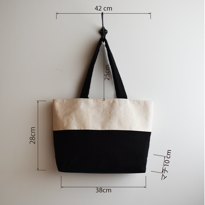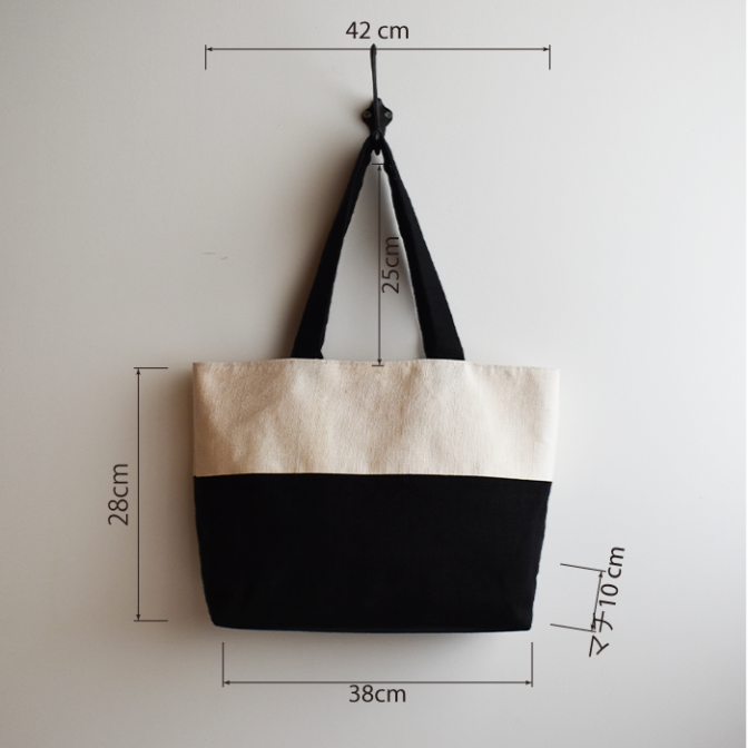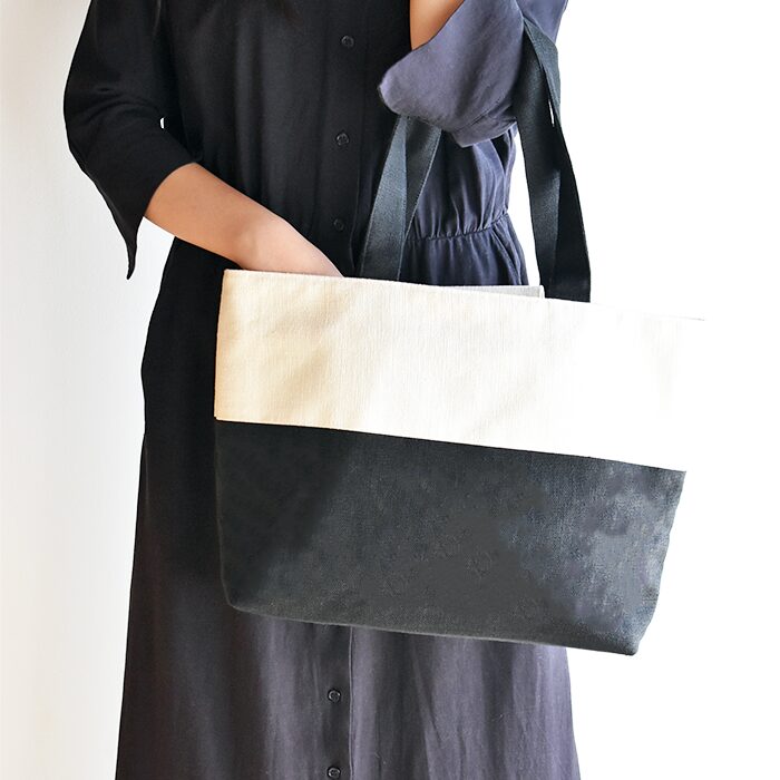 上部白い生地はヴィンテージ帯、下部黒い生地はリネン素材です。A4サイズが入り、マチは10cm。内ポケットもあり収納力抜群。こちらのヴィンテージ帯は自然の風合いが美しい生地です。こだわりのトートバッグです。